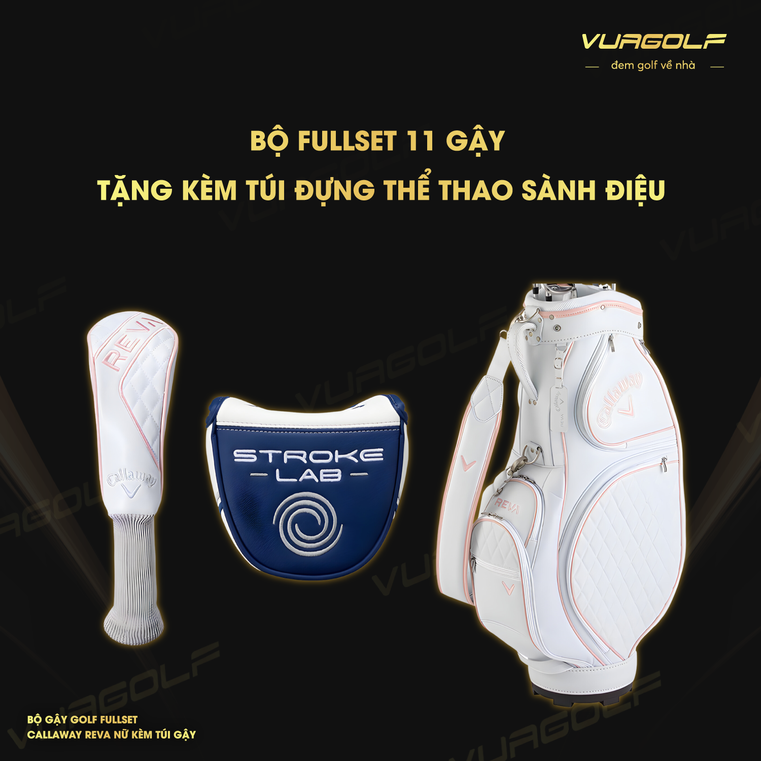 Bộ gậy Golf Fullset Callaway Reva thiết kế độc quyền công nghệ stroke lab cho khả năng truyền lực tốt, hiệu suất đánh cao và bổng hơn. Tặng kèm túi gậy REVA cao cấp và được thay thế bằng da cho thị trường châu Á giúp tăng độ bền và sang trọng cho các golfers nữ.