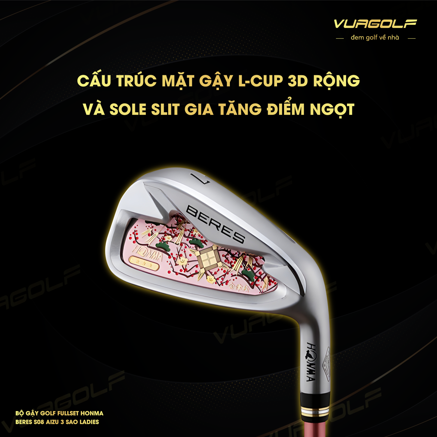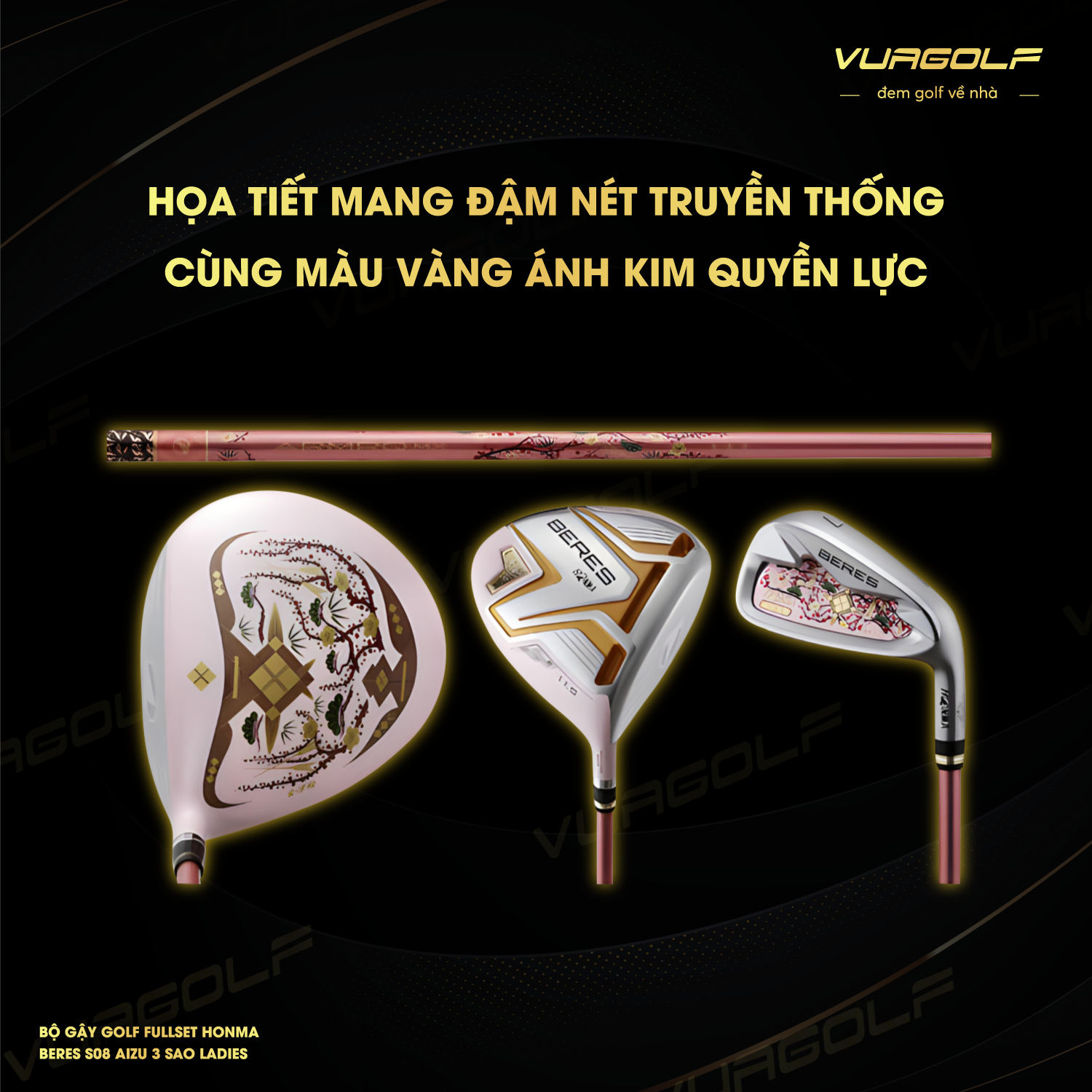 Bộ gậy golf fullset Honma Beres B08 Aizu 3 sao Ladies được tạo ra bởi hơn 100 nghệ nhân của xứ sở hoa anh đào. Sản phẩm gây ấn tượng mạnh với những hoa văn tinh tế mang đậm nét mùa xuân cùng gam màu vàng kim quý phái. Bên cạnh đó, sản phẩm còn được các golfer nữ yêu thích với công nghệ tiên tiến Unbalanced crown and Thin-walled giúp tăng hiệu suất vượt trội. Nhờ đó, golfer có thể sử dụng gậy kết hợp với các phụ kiện như thảm tập swing golf, lưới tập để nâng cao hiệu suất.