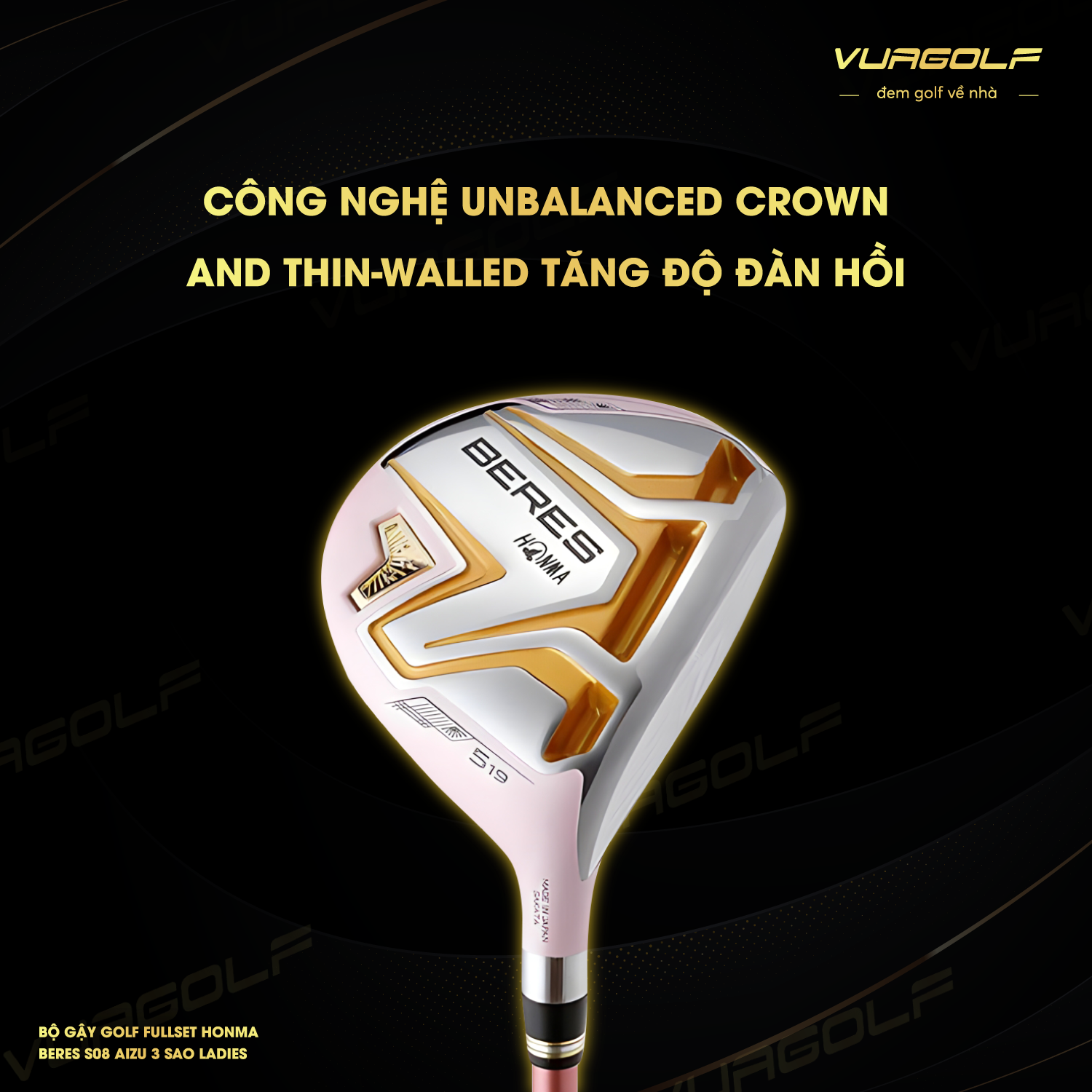 Bộ gậy Golf Fullset Honma Beres B08 Aizu 3 sao Ladies nổi bật với màu vàng kim, tôn lên vẻ sang trọng và quý phái của những nữ golfer. Đặc biệt, công nghệ Unbalanced crown and Thin-walled – “Khe ba” là một thành tựu mới đáng chú ý, giúp nâng cao hiệu suất cho người chơi.