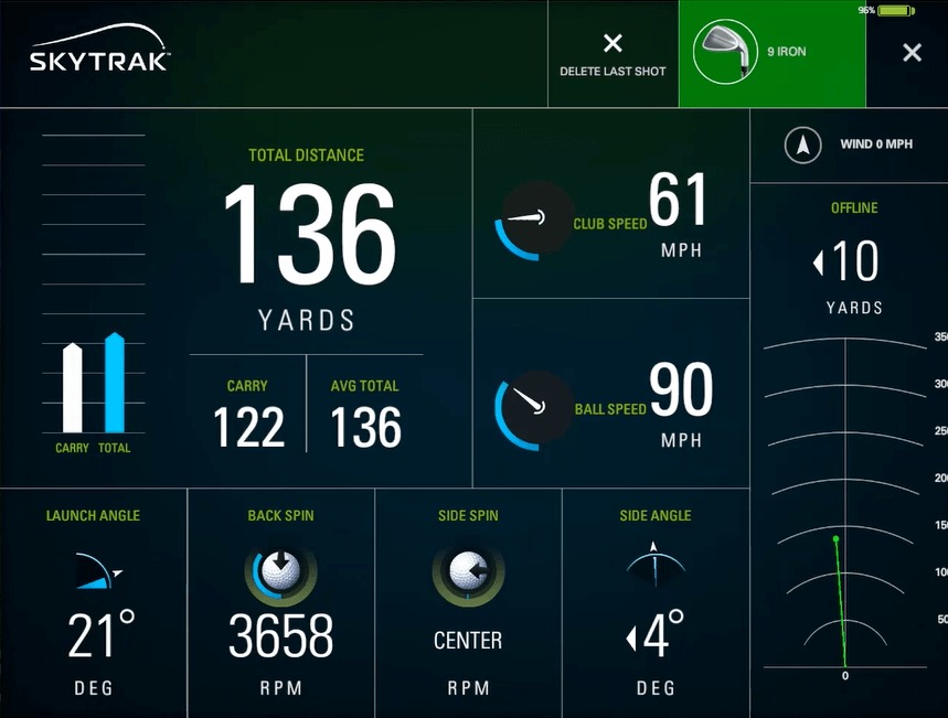 Với công nghệ Shot- Tracer, SkyTrak cho phép bạn nhận được tức thì các thông số như: hình dạng đường đi của bóng, góc đánh bóng, độ xoáy, và khoảng cách từng quả đánh bóng