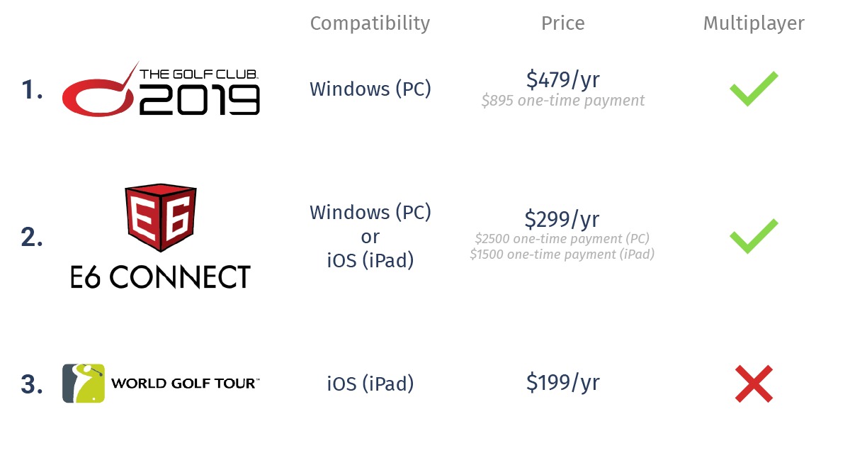 Ngoài ra để cho phòng golf 3D của bạn trở nên hoàn hảo hơn, và có thể chơi trên sân 18 hố và chơi online cùng bạn bè trên khắp thế giới, Mevo cung cấp khả năng tương thích với các phần mềm sau:
