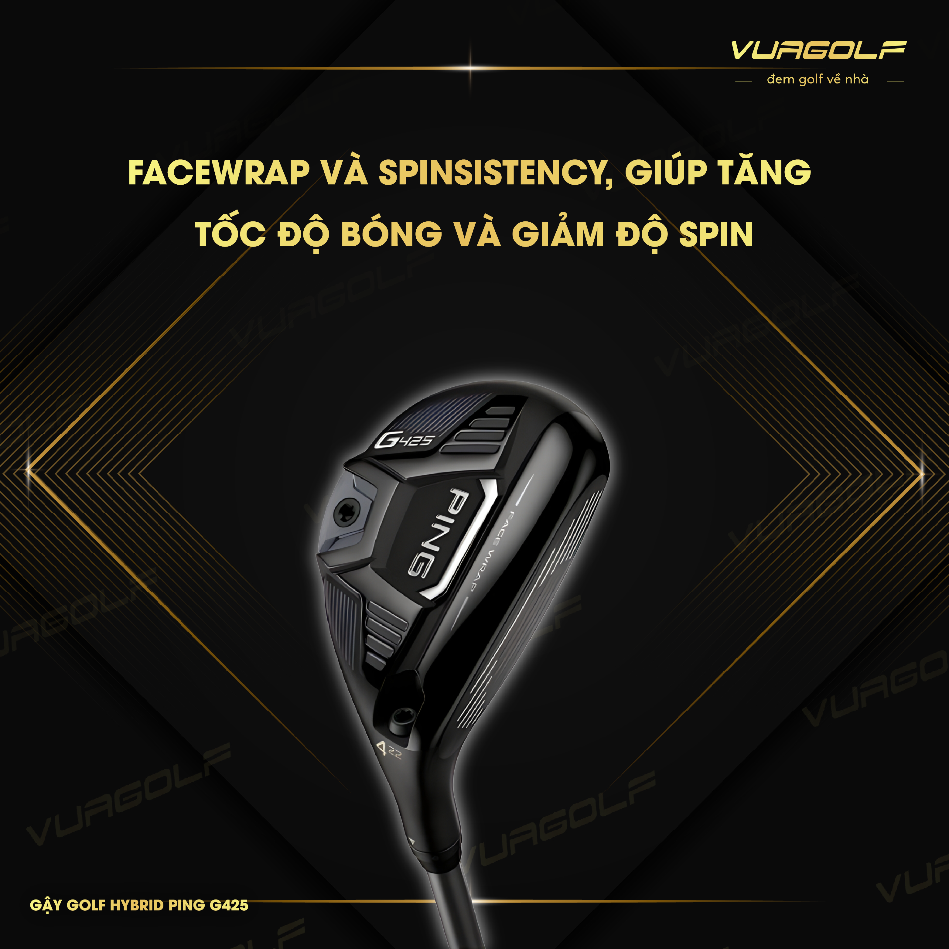 - Gậy golf Hybrid Ping G425 có công nghệ Facewrap và Spinsistency, giúp tăng tốc độ bóng và giảm độ spi. Công nghệ Facewrap làm cho mặt gậy được rèn từ thép maraging mỏng hơn và uốn cong hơn, tạo ra ảnh phóng cao và khoảng cách xa. Công nghệ Spinsistency làm cho độ cong khuôn mặt phức tạp hơn, giúp bình thường hóa vòng quay và tăng tốc độ bóng, đặc biệt khi đánh bóng ở phần dưới của mặt gậy.