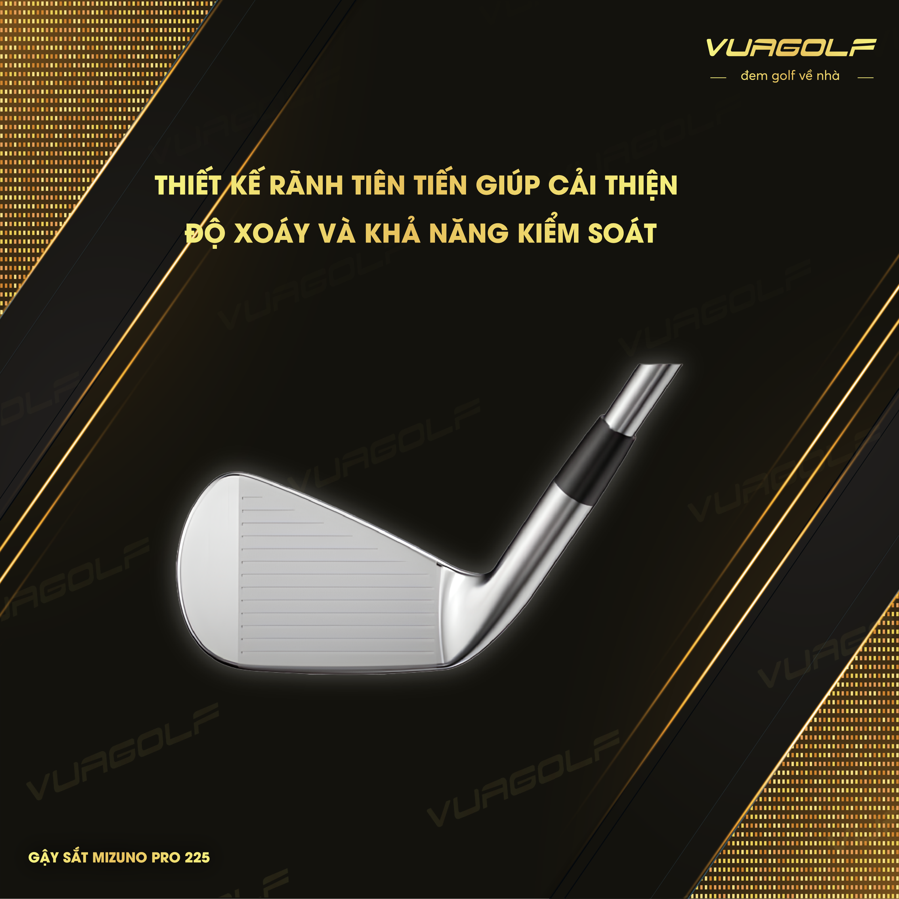 Gậy sắt Mizuno Pro 225 được thiết kế chú trọng đến độ chính xác và khả năng kiểm soát. Đường trên mỏng và đế hẹp của gậy cho phép người chơi dễ dàng kiểm soát và định hình cú đánh. Thiết kế rãnh tiên tiến của gậy cũng giúp cải thiện độ xoáy và khả năng kiểm soát, giúp việc dừng bóng trên green dễ dàng hơn.