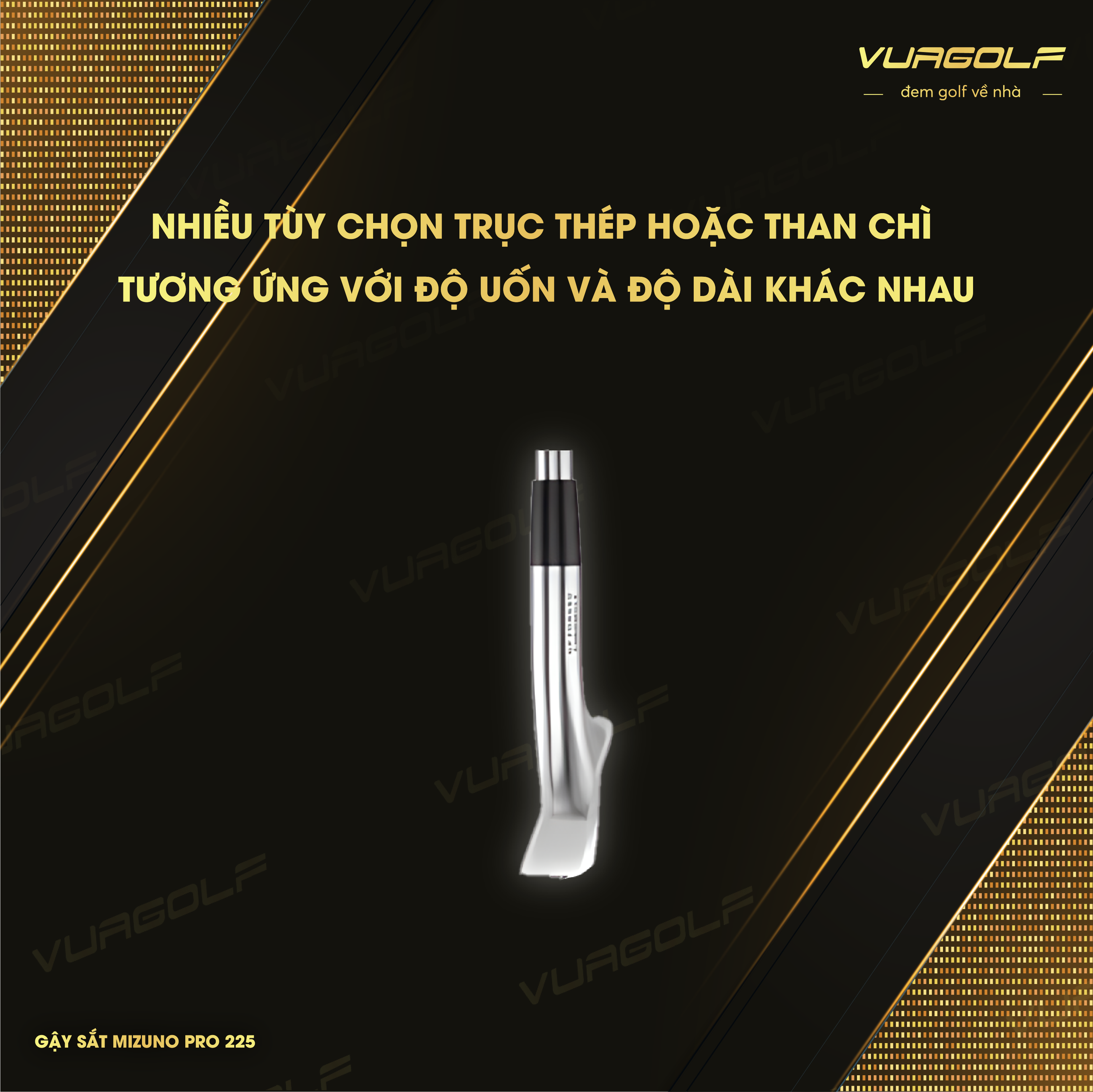 Gậy sắt Mizuno Pro 225 có sẵn nhiều tùy chọn trục, bao gồm thép và than chì tương ứng với độ uốn và độ dài khác nhau. Điều này cho phép người chơi golf có thể chọn trục phù hợp với nhu cầu và sở thích của họ. Hãng Mizuno cũng cung cấp thêm các tùy chọn có thể giúp tối ưu hóa hiệu suất của gậy cho từng người chơi.