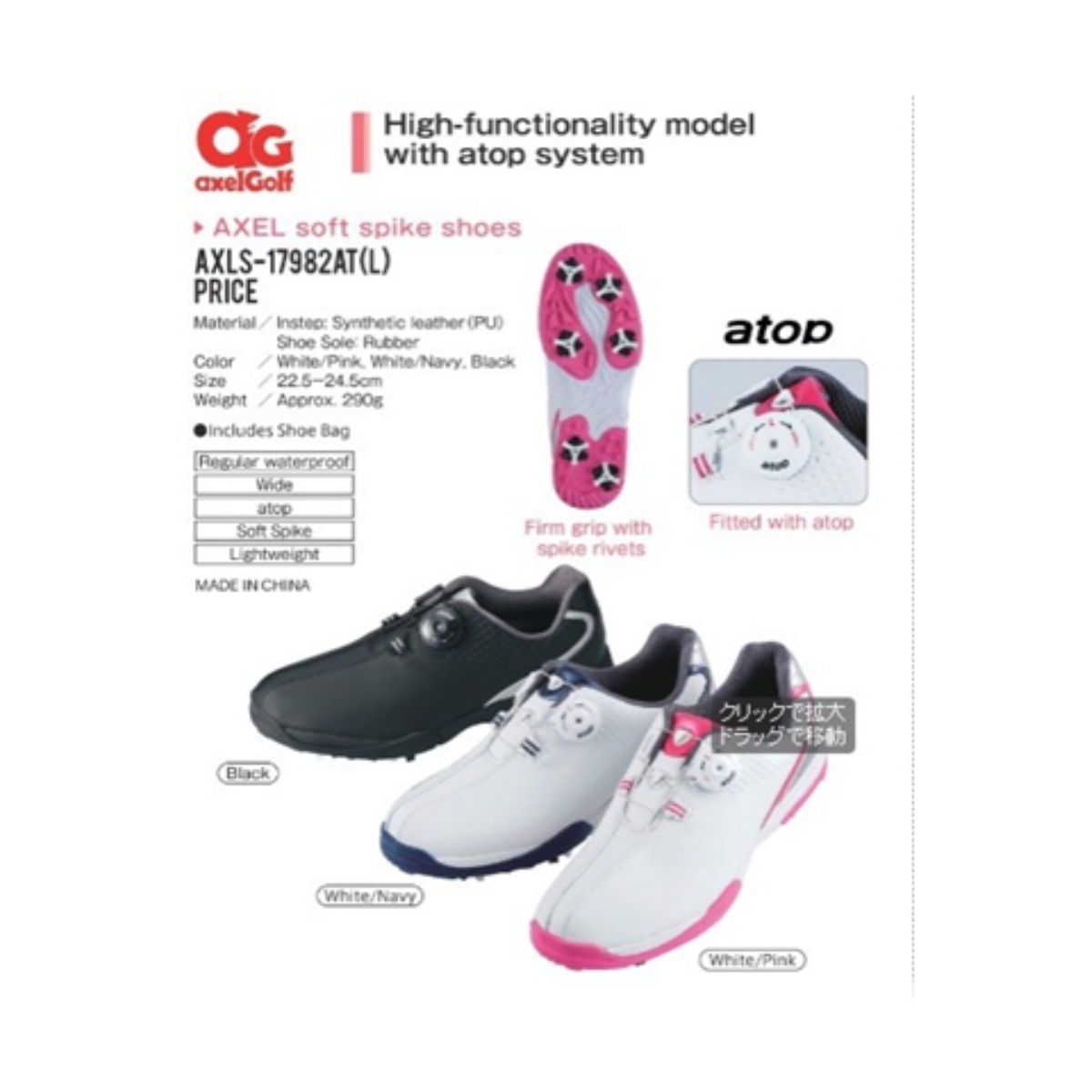 Giày Golf Tsuruya Axel Short-spike AXLS-17982AT sử dụng chất liệu Ssynthetic leather và Rubber với ưu điểm siêu thoáng khi, độ chống nước ổn định. Phần đế êm ái dễ dàng di chuyển trên mọi địa hình. Đủ size từ 22 – 24,5 với các tùy chọn màu White*Pink/ White*Navy/ White*Silver/ Black.